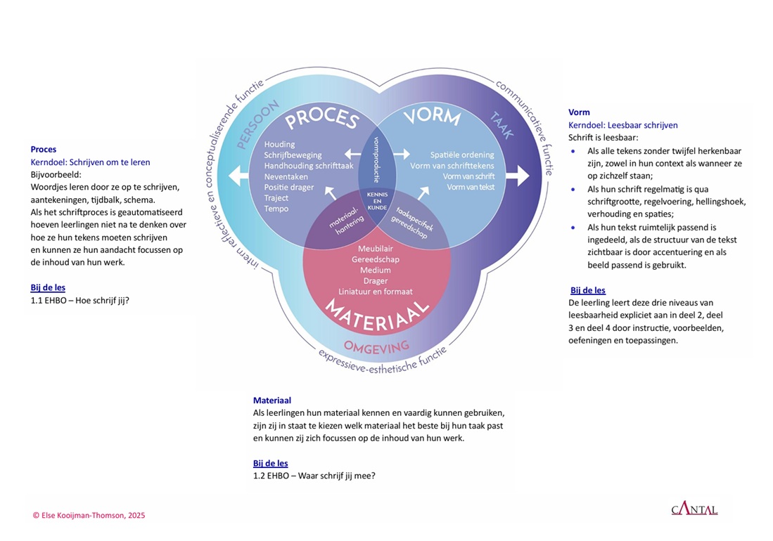 Het schriftproces (waaronder houding, pengreep, bladligging) en de schriftvorm (met de drie niveaus van leesbaarheid: identificeerbare tekens, regelmatig schrift, ordelijke tekst) worden expliciet uitgelegd, getoond in illustraties en filmpjes en geoefend.